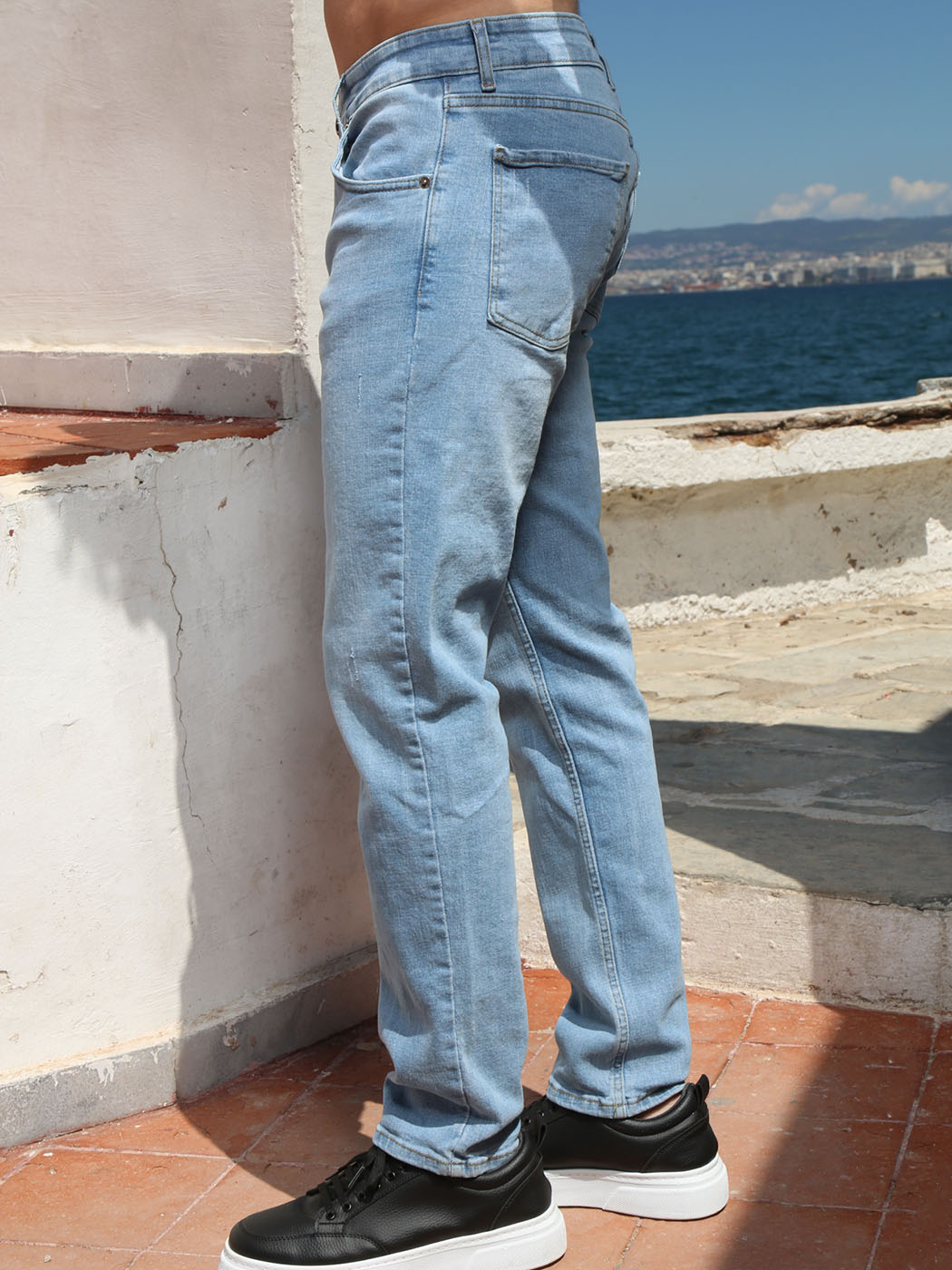 Ανανεωμένο ανδρικό denim παντελόνι με λίγη ελαστικότητα και ανοιχτό καλοκαιρινό χρώμα. Με γερές ραφές και πεντάτσεπο design, αυτό το jean είναι ιδανικό για να ντυθείς με στυλ.