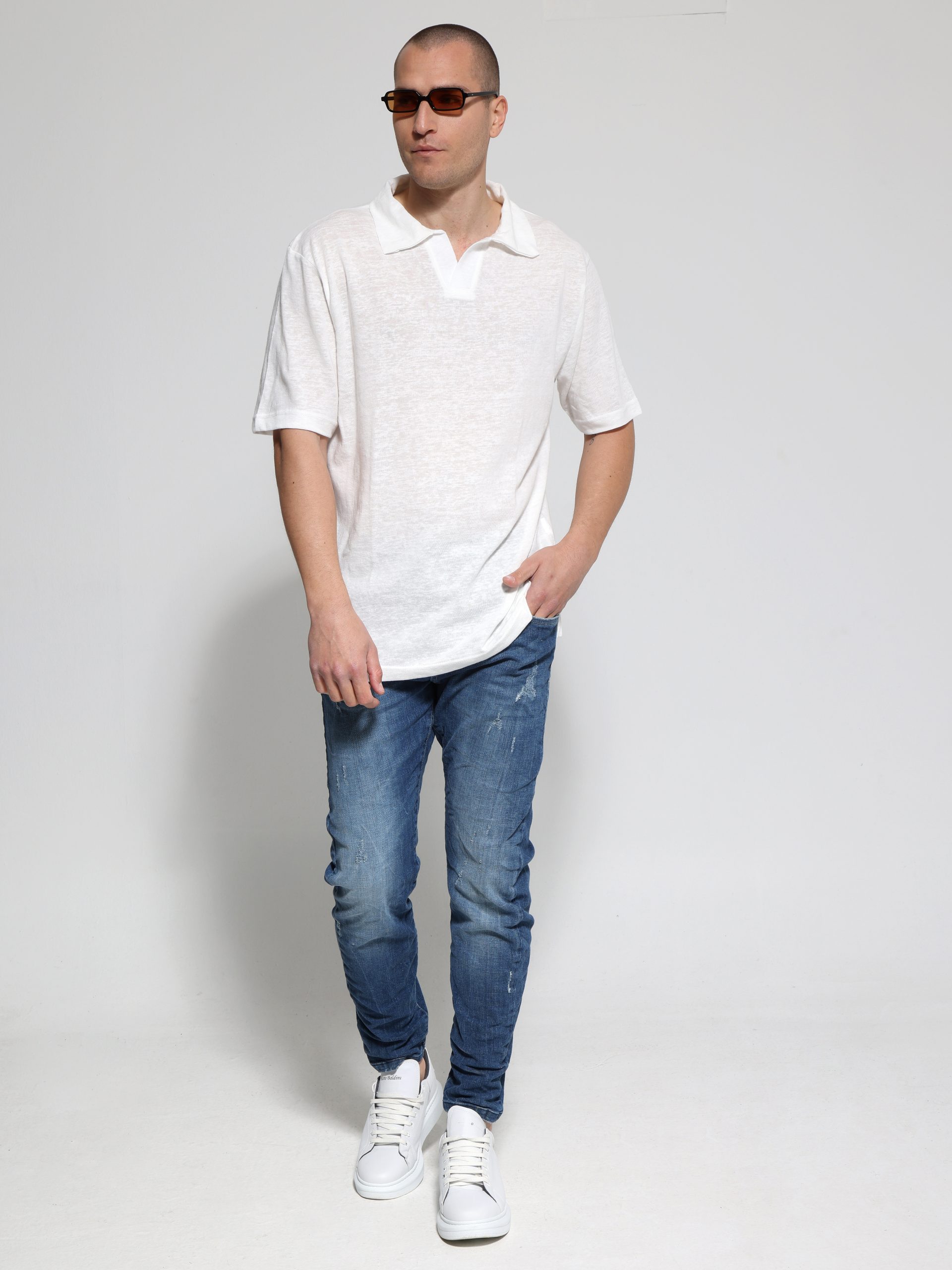 Ανανεωμένο ανδρικό denim παντελόνι με λίγη ελαστικότητα και μπλε καλοκαιρινό χρώμα. Με γερές ραφές και πεντάτσεπο design, αυτό το jean είναι ιδανικό για να ντυθείς με στυλ.