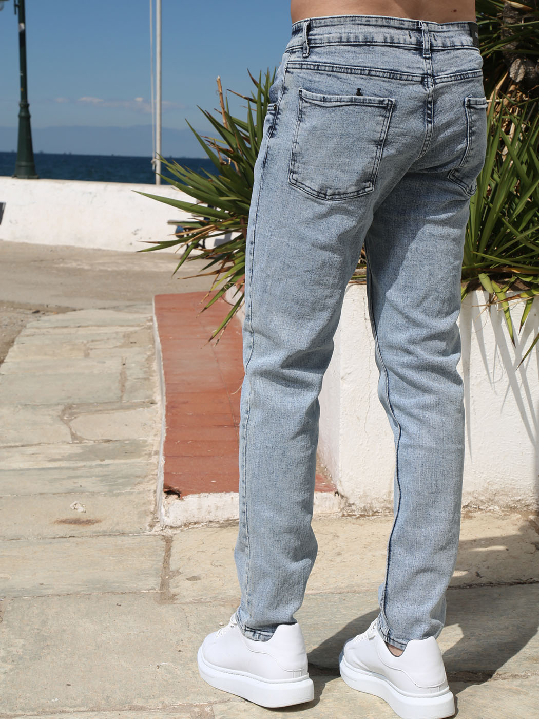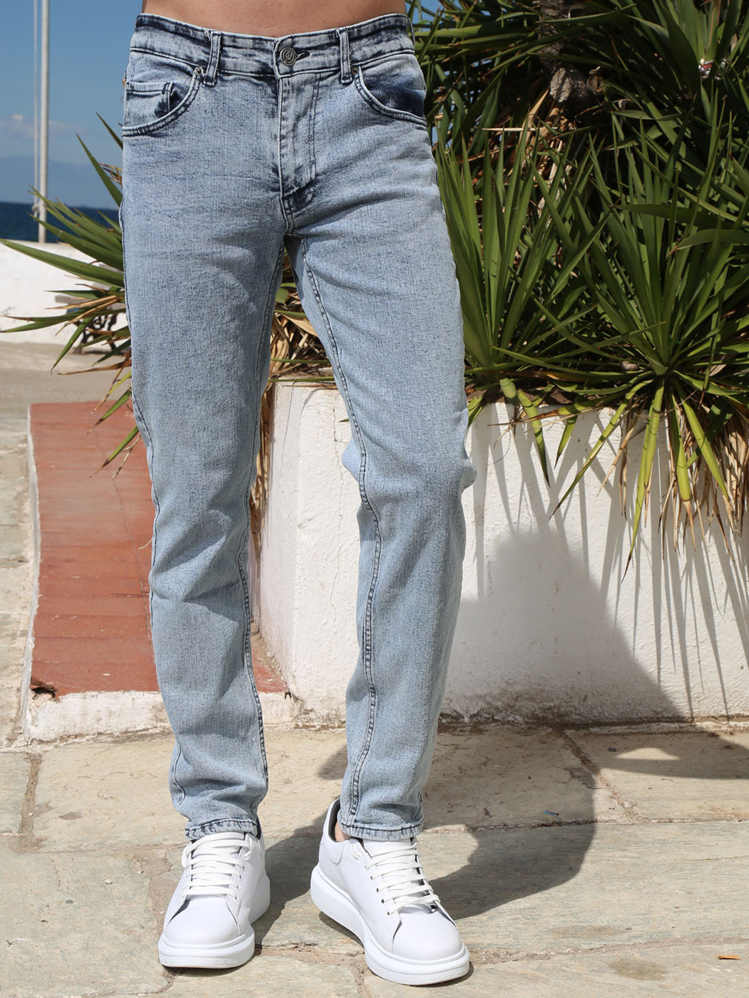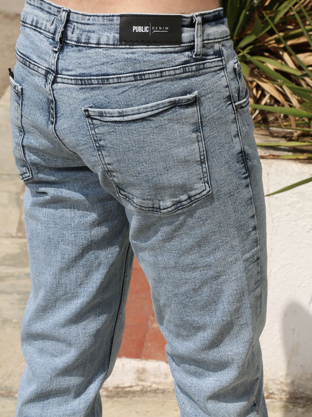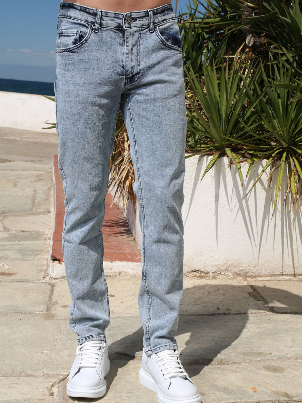Ανανεωμένο ανδρικό denim παντελόνι με λίγη ελαστικότητα και ανοιχτό καλοκαιρινό χρώμα. Με γερές ραφές και πεντάτσεπο design, αυτό το jean είναι ιδανικό για να ντυθείς με στυλ.