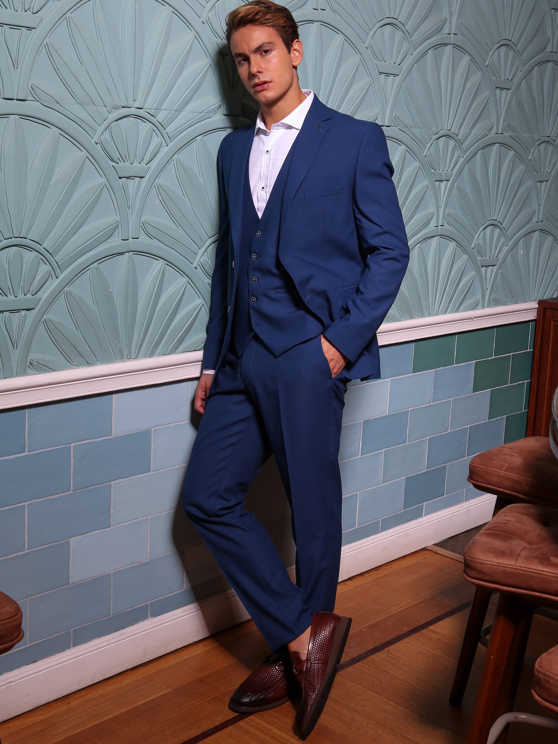 Αυτό το ανδρικό κοστούμι με γιλέκο είναι η ιδανική επιλογή για κάθε επίσημη περίσταση. Αποτελείται από παντελόνι, γιλέκο και σακάκι, όλα φτιαγμένα από ποιοτικά υφάσματα και εξαιρετικά υλικά που προσφέρουν άνεση και στυλ. Το παντελόνι διαθέτει δύο τσέπες στα πλάγια και κλείνει με φερμουάρ και κουμπί, εξασφαλίζοντας τέλεια εφαρμογή.