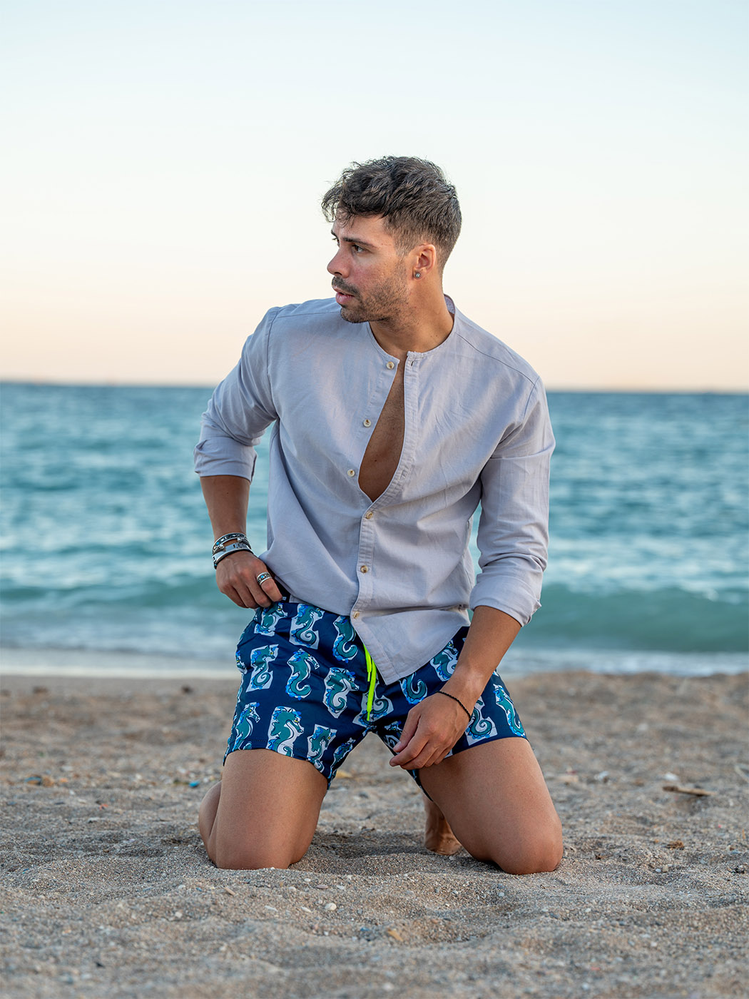 Ανδρικό μαγιό με λάστιχο και κορδόνι στη μέση. Τέλειο μήκος σορτσάκι, με τσέπες στο πλάι αλλά και μία πίσω. Μοναδικό και ιδιαίτερο για όλο το καλοκαίρι να κάνει τη διαφορά.
