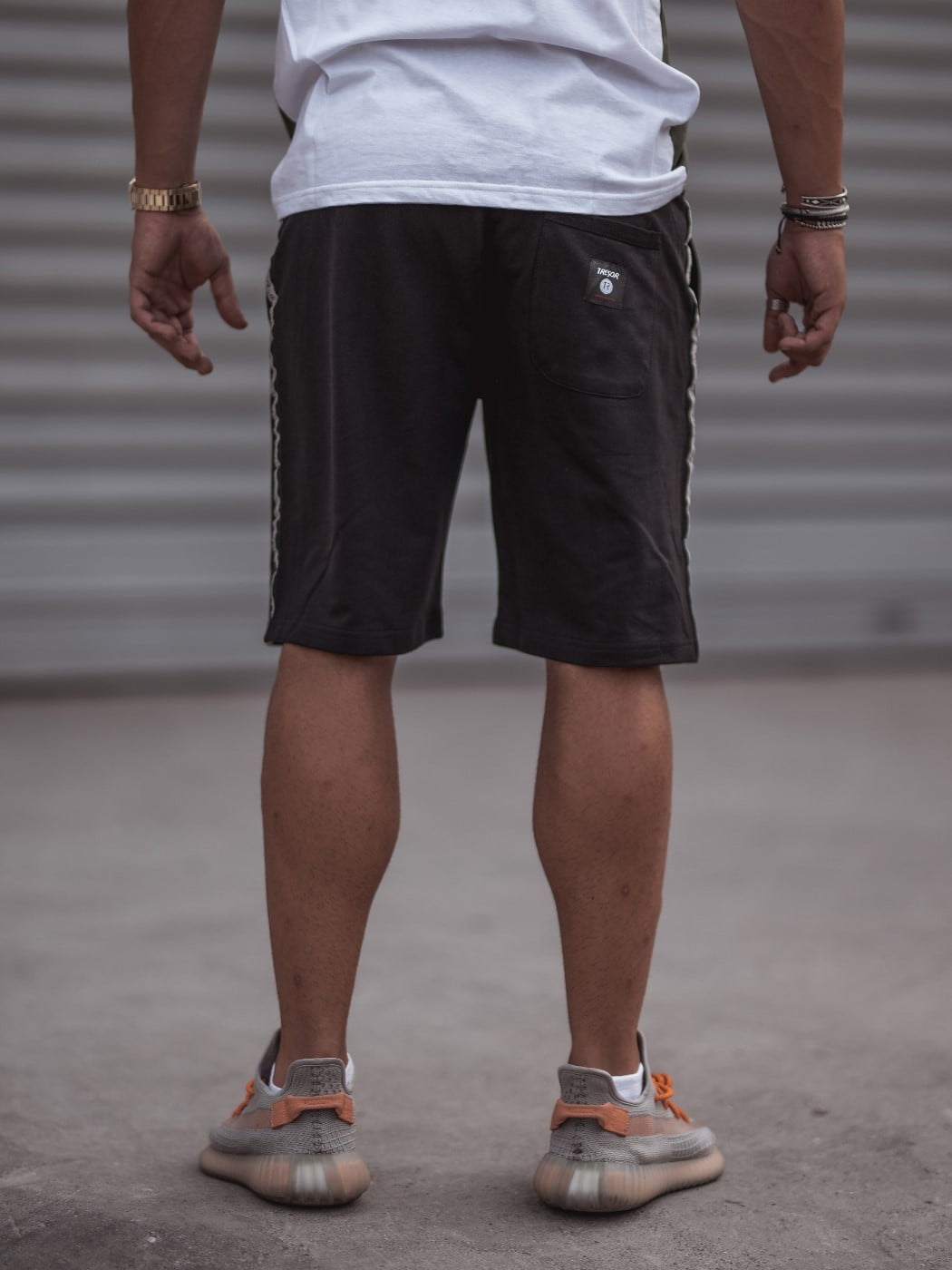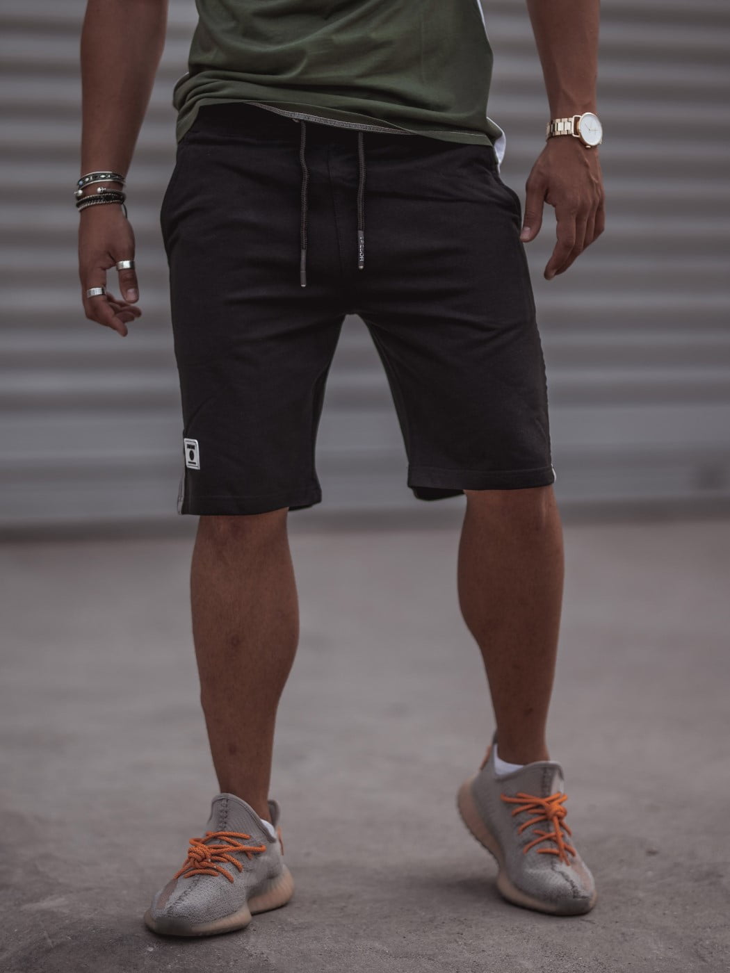 Ανδρική βερμούδα μαύρη με σχέδιο στο πλάι, σε φούτερ ελαφρύ με τσέπες, λάστιχο και κορδόνι.
