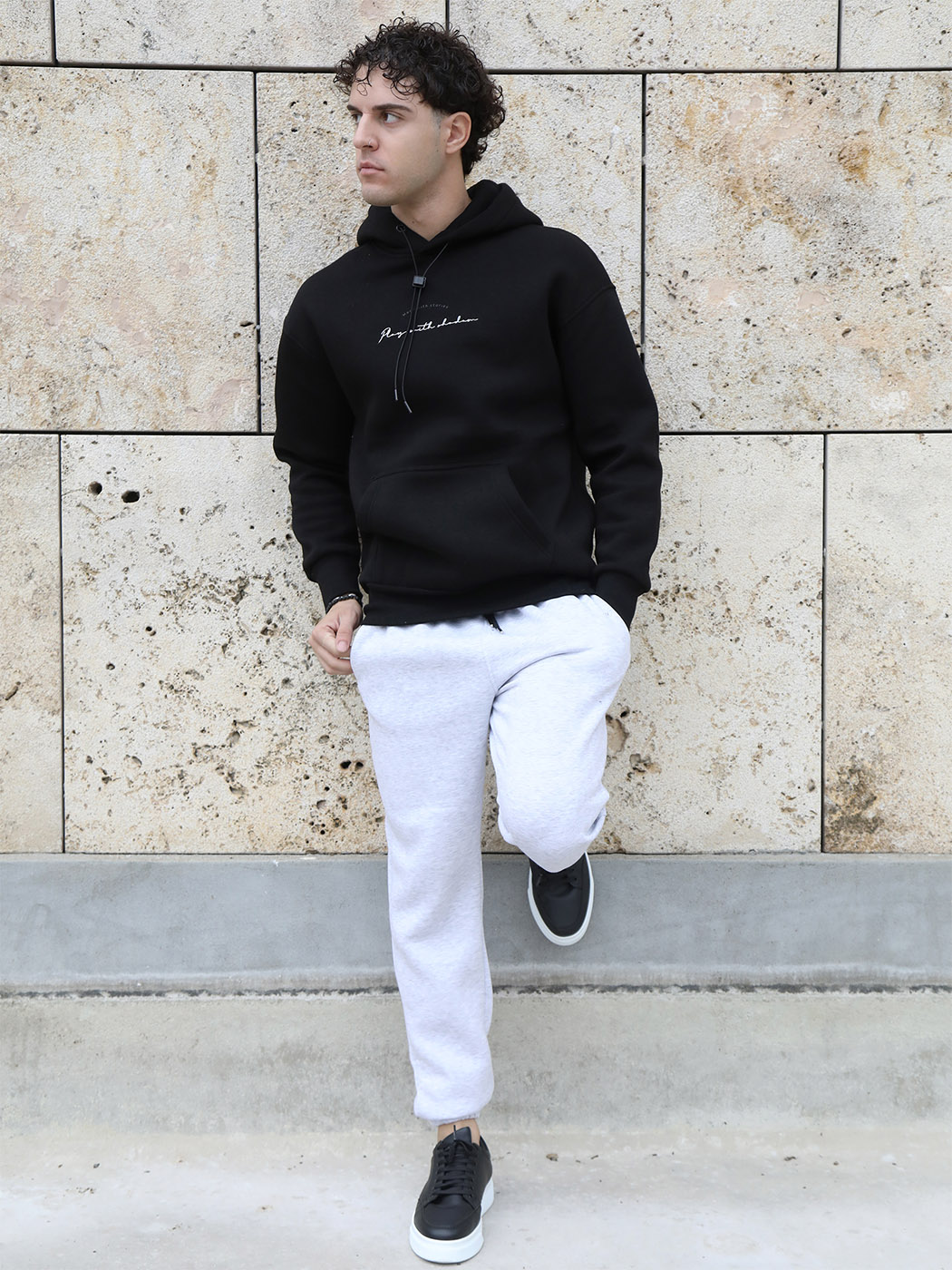 Μία αθλητική φόρμα τύπου jogger με λάστιχο και κορδόνι στη μέση, λάστιχο στους αστραγάλους για κάθε στιγμή της ημέρας και φυσικά για μία έξοδο το βράδυ, όπως επίσης και στο γυμναστήριο για να κάνετε τη διαφορά σε κάθε σας ντύσιμο. Διαθέτει δύο τσέπες στο πλάι και μία πίσω, κεντημένο λογότυπο το οποίο δίνει ένταση στο σύνολο.